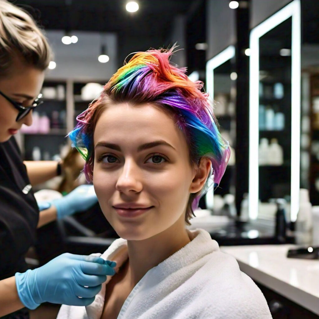 Finally, drape a cape or an old towel over your shoulders to protect your clothing, because while we love colour on our hair, our wardrobe might not share the sentiment! Now, let’s get organized. Place your tools within easy reach and ensure you have a mirror handy to monitor your progress. You’re the artist, and your hair is the canvas – with everything in place, it’s almost time to create your colourful masterpiece. But first, gloves on! we want to keep those hands looking just as lovely as your soon-to-be-coloured locks.